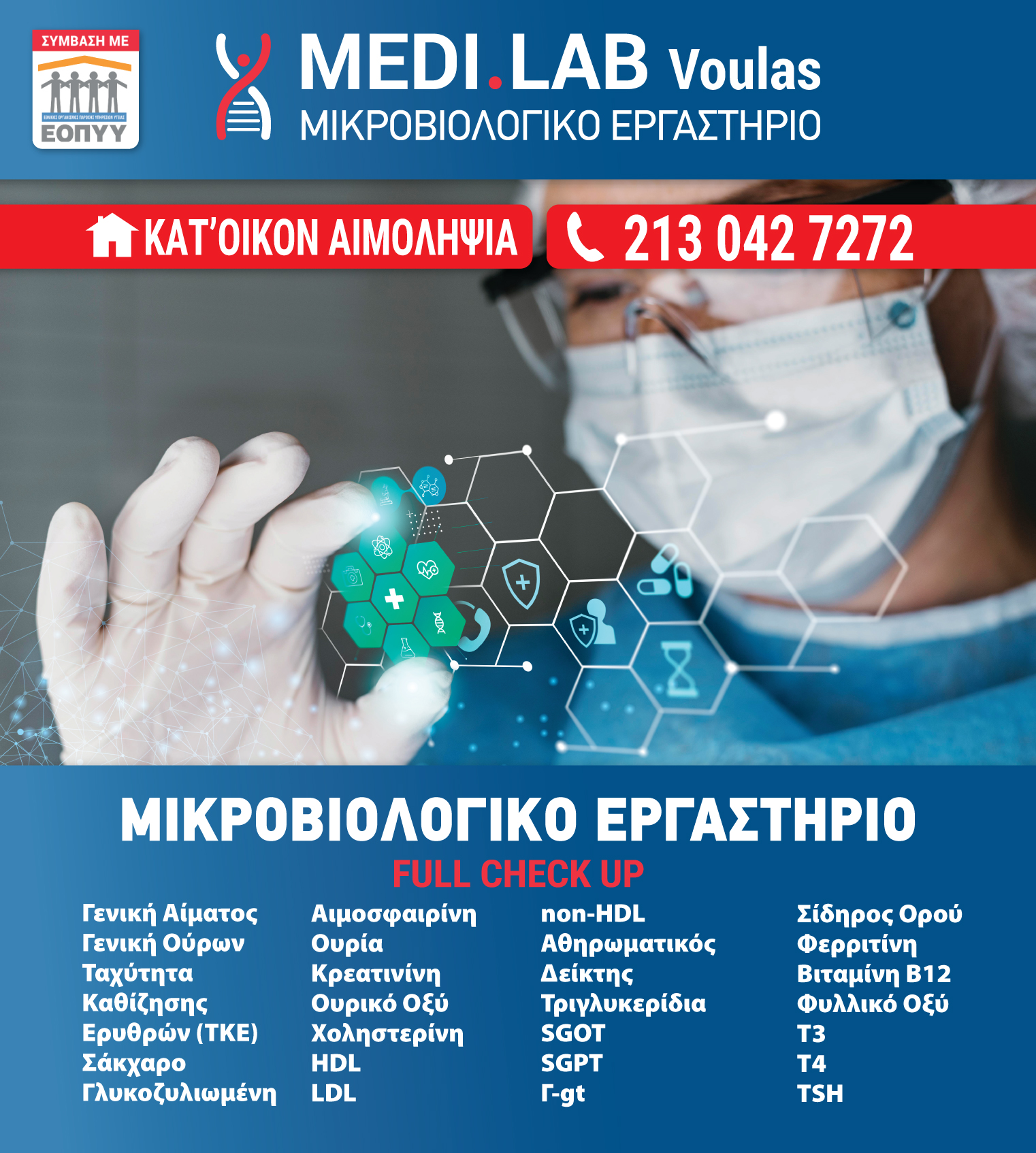 ΜΙΚΡΟΒΙΟΛΟΓΙΚΑ ΕΡΓΑΣΤΗΡΙΑ, ΜΙΚΡΟΒΙΟΛΟΓΟΙ, ΒΙΟΠΑΘΟΛΟΓΟΙ, ΑΙΜΟΤΟΛΟΓΙΚΟ, ΒΙΟΧΗΜΙΚΟ, ΟΡΜΟΝΟΛΟΓΙΚΟ, ΑΝΟΣΟΛΟΓΙΚΟ, ΠΡΟΓΕΝΝΗΤΙΚΟΣ ΕΛΕΓΧΟΣ, ΣΥΜΒΕΒΛΗΜΕΝΟ ΜΕ ΤΑΜΕΙΟ ΔΗΜΟΣΙΟΓΡΑΦΩΝ & ΕΥΔΑΠ, ΣΥΜΒΑΣΗ ΜΕ ΟΛΑ ΤΑ ΤΑΜΕΙΟ ΕΟΠΥΥ, ΚΑΤ' ΟΙΚΟΝ ΑΙΜΟΛΗΨΙΑ, ΒΟΥΛΑ, ΒΟΥΛΑ, ΒΟΥΛΑ
