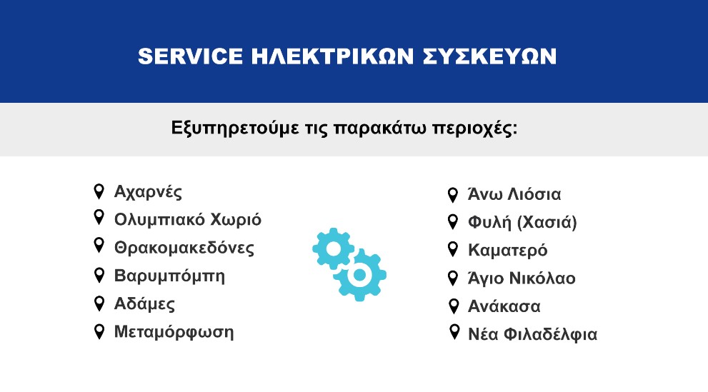 Η επιχείρησή μας στις Αχαρνές ασχολείται με τις επισκευές ηλεκτρικών συσκευών. Το έμπειρο και εξειδικευμένο προσωπικό μας αναλαμβάνει την επισκευή ηλεκτρικών οικιακών συσκευών όπως τηλεοράσεις, πλυντήρια ρούχων και πιάτων, εστίες, απορροφητήρες, φούρνους μικροκυμάτων, μικροσυσκευές κουζίνας, μίξερ, καφετιέρες, κουζίνες, στεγνωτήρια, ψυγεία, αφυγραντήρες, συστήματα σιδερώματος, ηλεκτρικές σκούπες, ραπτομηχανές και χύτρες.