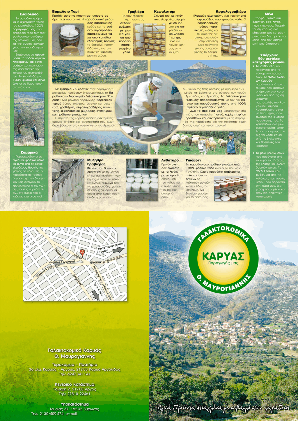 ΓΑΛΑΚΤΟΚΟΜΙΚΑ ΚΑΡΥΑΣ : ΤΥΡΟΚΟΜΕΙΟ, 3o χλμ ΚΑΡΥΑΣ-ΑΡΓΟΥΣ ,ΤΚ 21200. ΚΕΝΤΡΙΚΟ : TΣΩΚΡΗ 2,ΑΡΓΟΣ ,ΤΗΛ 2751022461. ΥΠΟΚΑΤΑΣΤΗΜΑ : ΜΥΣΙΑΣ 37 & ΚΑΡΑΟΛΗ & ΔΗΜΗΤΡΙΟΥ,ΒΥΡΩΝΑΣ ΑΤΤΙΚΗ,ΤΚ 16231 ,ΤΗΛ 2130409474 ΤΥΡΟΚΟΜΙΚΑ ΠΡΟΙΟΝΤΑ-ΓΑΛΑΚΤΟΚΟΜΙΚΑ ΠΡΟΙΟΝΤΑ ,ΠΑΡΑΓΩΓΗ & ΕΜΠΟΡΙΑ ΤΥΡΟΚΟΜΙΚΩΝ ΠΡΟΙΟΝΤΩΝ