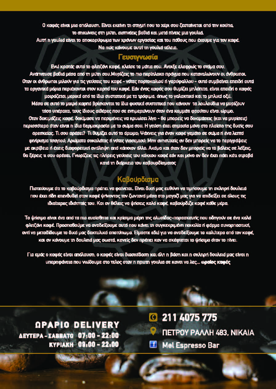 MEL-MEL ESPRESSO BAR-MEL MICROROASTERY Αναψυκτήριο ΝΙΚΑΙΑ- ΚΑΦΕ ΝΙΚΑΙΑ-Καφετέρια - Νίκαια, Χαλκηδόνα ΚΑΦΕ- BRUNCH ΝΙΚΑΙΑ-PANCAKES NIKAIA- ΒURGER ΝΙΚΑΙΑ- ΡΟΦΗΜΑΤΑ ΝΙΚΑΙΑ ΥΠΗΡΕΣΙΑ DELIVERY ΩΡΑΡΙΟ: