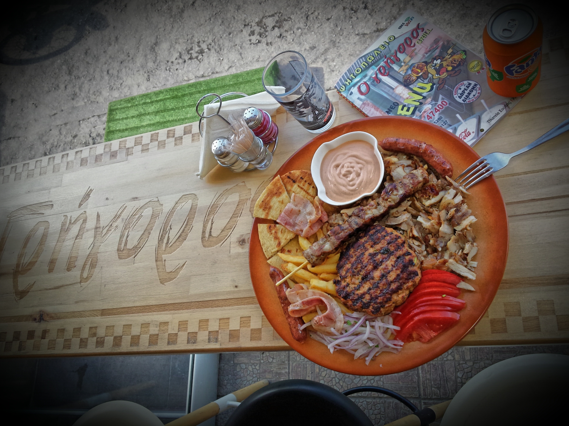 Χρησιμοποιώντας άριστης ποιότητας υλικά και εκλεκτά κρέατα, που παραλαμβάνει καθημερινά από ντόπιες επιχειρήσεις, δημιουργεί ένα πλούσιο menu ψητών εδεσμάτων.