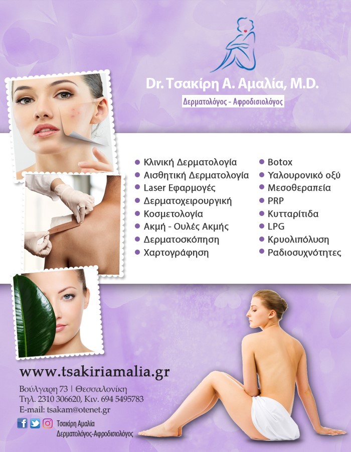 ΤΣΑΚΙΡΗ Α. ΑΜΑΛΙΑ Δερματολόγος - Αφροδισιολόγος - Laser Λεϊζερ, Αποτριχωση Apotrixosi, Ουλες Oules, Ακμη Akmi, Ευρυαγγειες Evriaggies, Botox, Υαλουρονικο Οξυ Yalouroniko Oxy, Rpr Μεσοθεραπεια Rpr Mesotherapia, Peeling, Σπιλοι, Μυκητιασεις Mikitiaseis, Lpg Endermologie, Lifting Με Νηματα Lifting Me Nimata, Κυτταριτιδα Kyttaritida, Ραδιοσυχνοτητες Radiosixnotites, 2310306620 , 6945495783