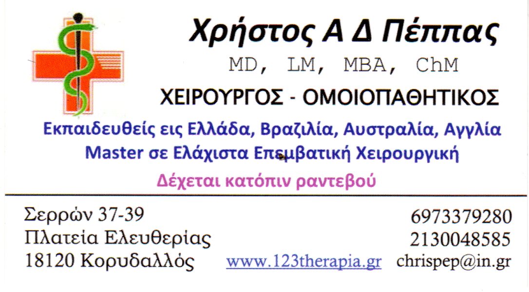 DR ΠΕΠΠΑΣ ΧΡΗΣΤΟΣ ΣΕΡΡΩΝ 37-39 ΚΟΡΥΔΑΛΛΟΣ 18120 Ν.ΑΤΤΙΚΗΣ ΤΗΛ:2130048585 ΚΙΝ:6973379280 ΥΓΕΙΑ ΙΑΤΡΟΙ ΓΕΝΙΚΟΣ ΧΕΙΡΟΥΡΓΟΣ ΣΤΟΝ ΚΟΡΥΔΑΛΛΟ , ΓΕΝΙΚΟΣ ΧΕΙΡΟΥΡΓΟΣ ΣΤΟ Ν.ΑΤΤΙΚΗΣ, ΓΕΝΙΚΗ ΧΕΙΡΟΥΡΓΙΚΗ ΣΤΟΝ ΚΟΡΥΔΑΛΛΟ, ΓΕΝΙΚΗ ΧΕΙΡΟΥΡΓΙΚΗ ΣΤΟ Ν.ΑΤΤΙΚΗΣ, ΟΜΟΙΟΠΑΘΗΤΙΚΗ ΣΤΟΝ ΚΟΡΥΔΑΛΛΟ, ΟΜΟΙΟΠΑΘΗΤΙΚΗ ΣΤΟ Ν.ΑΤΤΙΚΗΣ, ΟΜΟΙΟΠΑΘΗΤΙΚΟΣ ΚΥΨΕΛΗ