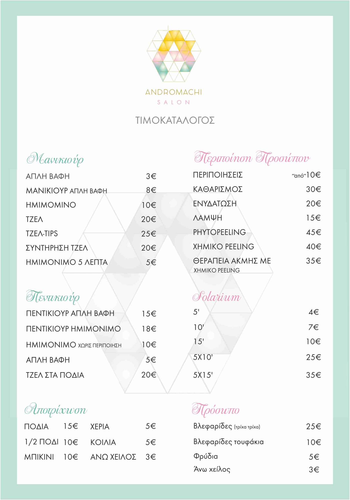 ΚΕΝΤΡΟ ΑΙΣΘΗΤΙΚΗΣ, ΜΑΝΙΚΙΟΥΡ ΠΕΝΤΙΚΙΟΥΡ, ΟΝΥΧΟΠΛΑΣΤΙΚΗ, ΤΕΧΝΙΚΑ ΝΥΧΙΑ, EXTENSION ΒΛΕΦΑΡΙΔΩΝ, ΒΑΦΗ ΦΡΥΔΙΩΝ, ΧΕΝΑ ΦΡΥΔΙΩΝ, ΠΕΡΙΠΟΙΗΣΗ ΠΡΟΣΩΠΟΥ, ΚΑΘΑΡΙΣΜΟΣ ΠΡΟΣΩΠΟΥ, PHYTOPEELING, ΧΗΜΙΚΟ PEELING, ΜΑΣΑΖ, ΛΙΠΟΜΕΤΡΗΣΗ ΚΑΙ ΔΙΑΤΡΟΦΗ, SOLARIOUM, ΠΕΡΙΠΟΙΗΣΗ ΣΩΜΑΤΟΣ, ΑΔΥΝΑΤΙΣΜΑ, ΑΠΟΤΡΙΧΩΣΗ, LAZER, ΔΕΡΜΟΑΠΟΞΕΣΗ ΜΕ ΜΙΚΡΟΚΡΥΣΤΑΛΛΟΥΣ ΚΑΙ ΔΙΑΜΑΝΤΗ, ΤΑΤΤΟΥ ΦΡΥΔΙΩΝ, ΕΥΟΣΜΟΣ ΘΕΣΣΑΛΟΝΙΚΗΣ.