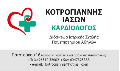 ΚΑΡΔΙΟΛΟΓΟΙ ΙΩΑΝΝΙΝΑ Dr ΚΟΤΡΟΓΙΑΝΝΗΣ ΙΑΣΩΝ Διδακτωρ Ιατρικής Σχολής Πανεπιστημίου Αθηνών Καρδιολογικός έλεγχος Υπέρηχος καρδιάς Δοκιμασία κοπωσης Holter ρυθμού πίεσης Προαθλητικός έλεγχος
