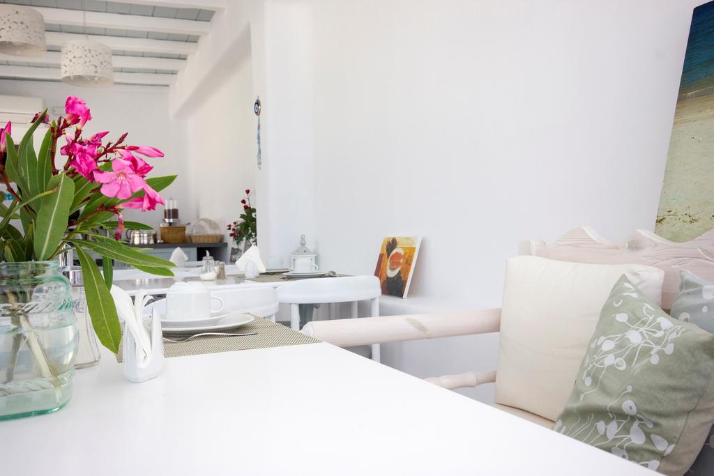 Το πρωινό σερβίρεται στη βεράντα, με εκπληκτική θέα στη Χώρα της Μυκόνου και στη Δήλο. Το απόγευμα μπορείτε να απολαύσετε ένα ποτήρι κρασί παρακολουθώντας τα καράβια που διασχίζουν τη θάλασσα.