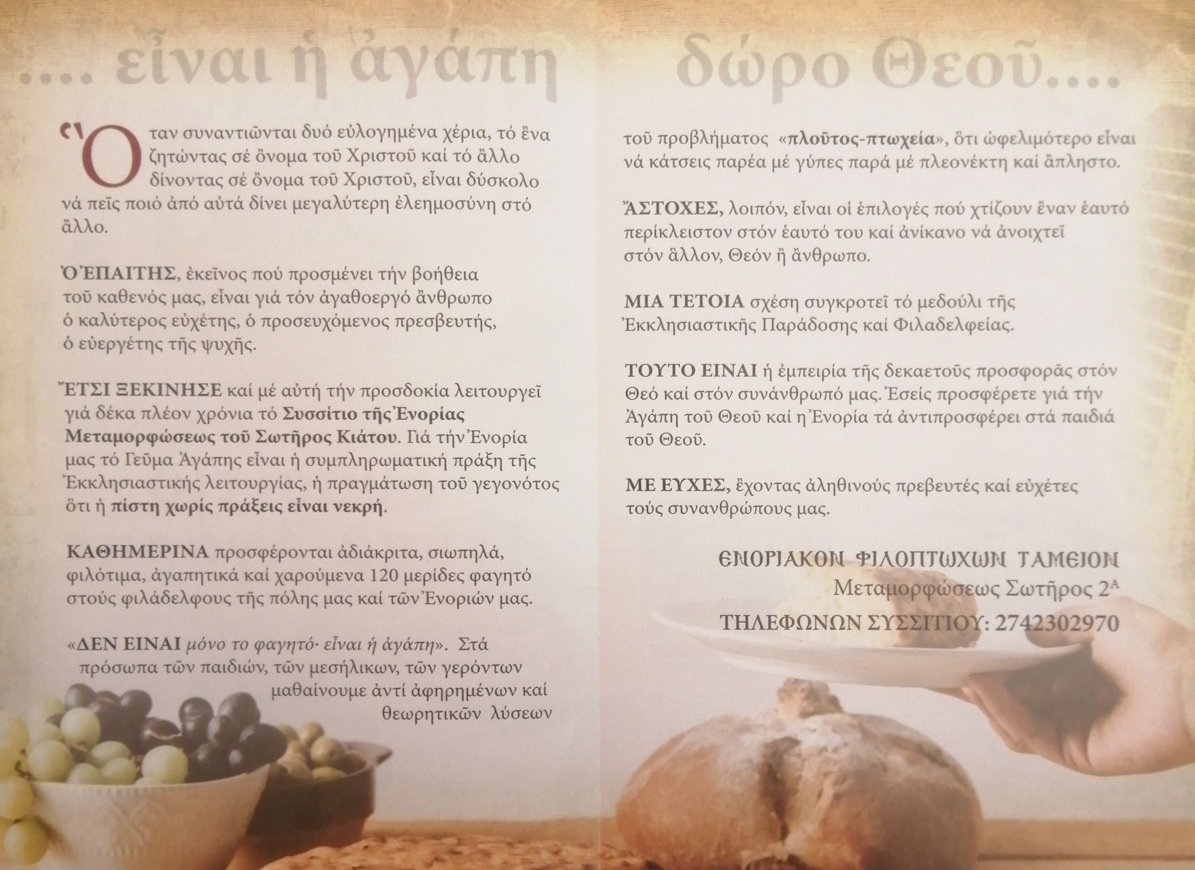 Στα πλαίσια της ενοριακής ποιμαντικής λειτουργούν: α) Κάθε Σαββάτο και Κυριακή παιδικές & κατηχητικές συντροφιές, β)Συσσίτιο - γεύμα αγάπης, το οποίο βρίσκεται παραπλεύρως του Ιερού Ναού (Μεταμορφώσεως Σωτήρος 2Α, τηλεφ. 2742302970).