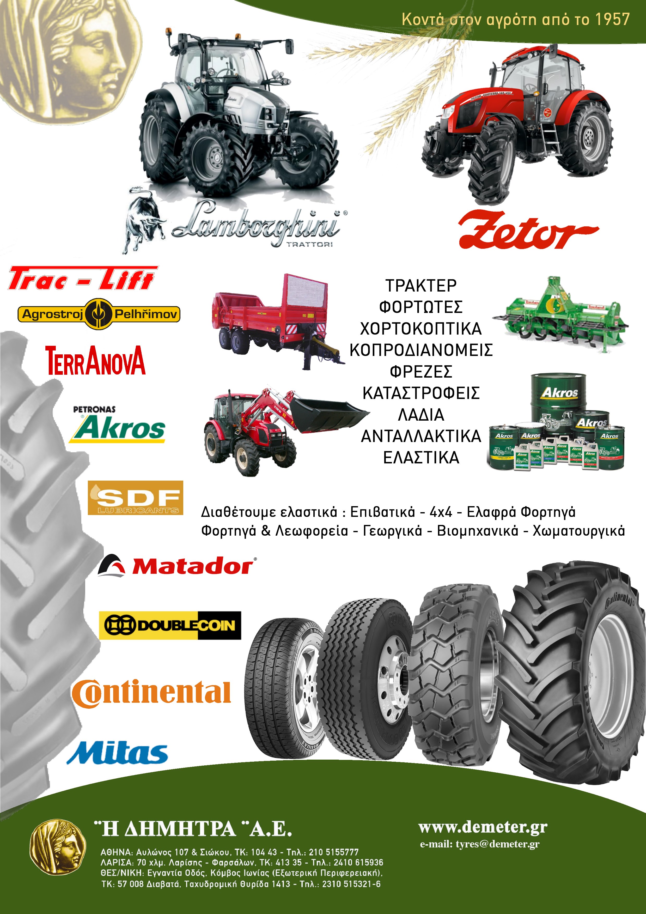 ‘’Η ΔΗΜΗΤΡΑ’’ Α.Ε. είναι μια εμπορική εταιρία με μακρά ιστορία στον κλάδο των γεωργικών μηχανημάτων. Είναι ο επίσημος εισαγωγέας των ελκυστήρων Lamborghini, Zetor & Hurlimann για την ελληνική αγορά καθώς και των παρελκομένων Caffini & Nardi. H εταιρία εκπροσωπεί επίσης τα γεωργικά – βιομηχανικά ελαστικά Mitas και τα λιπαντικά Arbor της PETRONAS. Η εμπειρία και η γνώση του αντικειμένου αποτελούν το μεγάλο της πλεονέκτημα. Το 2020 συμπληρώθηκαν τα 65 χρόνια συνεχούς δυναμικής παρουσίας, παρέχοντας στους πελάτες της άμεση τεχνική υποστήριξη μέσω ενός εκτεταμένου δικτύου αντιπροσώπων και συνεργείων που διαθέτει.