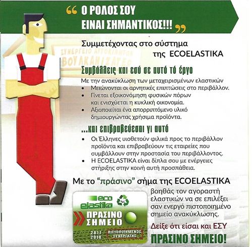 Η εταιρεία μας είναι πιστοποιημένος συνεργάτης της ECO ELASTICA και για το 2019 – 2020 εξακολουθεί να αποτελεί ΠΡΑΣΙΝΟ ΣΗΜΕΙΟ συλλογής ελαστικών ECO POINT. Η συμβολή μας στην ανακύκλωση περιλαμβάνει μέταλλα από φρένα και αμορτισέρ καθώς και φρέον, λάδια και φίλτρα.