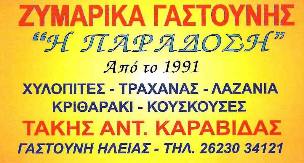 ΕΡΓΑΣΤΗΡΙΟ ΖΥΜΑΡΙΚΩΝ Η ΠΑΡΑΔΟΣΗ ΣΤΗ ΓΑΣΤΟΥΝΗ ΗΛΕΙΑΣ, ΖΥΜΑΡΙΚΑ ΣΤΗ ΓΑΣΤΟΥΝΗ ΗΛΕΙΑΣ, ΧΥΛΟΠΙΤΕΣΓΑΣΤΟΥΝΗ ΗΛΕΙΑΣ, ΤΡΑΧΑΝΑΣ ΓΑΣΤΟΥΝΗ ΗΛΕΙΑΣ, ΛΑΖΑΝΙΑ ΓΑΣΤΟΥΝΗ ΗΛΕΙΑΣ, ΚΡΙΘΑΡΑΚΙ ΓΑΣΤΟΥΝΗ ΗΛΕΙΑΣ, ΚΟΥΣΚΟΥΣΕΣ ΣΤΗ ΓΑΣΤΟΥΝΗ ΗΛΕΙΑΣ, ΧΟΝΔΡΙΚΟ ΚΑΙ ΛΙΑΝΙΚΟ ΕΜΠΟΡΙΟ ΖΥΜΑΡΙΚΩΝ ΣΤΗ ΓΑΣΤΟΥΝΗ ΗΛΕΙΑΣ, ΠΑΡΑΛΑΜΒΑΝΟΥΜΕ ΤΑ ΔΙΚΑ ΣΑΣ ΑΥΓΑ ΚΑΙ ΦΤΙΑΧΝΟΥΜΕ ΖΥΜΑΡΙΚΑ ΤΗΣ ΑΡΕΣΚΕΙΑΣ ΣΑΣ ΣΤΗ ΓΑΣΤΟΥΝΗ ΗΛΕΙΑΣ, ΝΟΜΟΣ ΗΛΕΙΑΣ