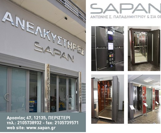 Η τεχνική εταιρεία Sapan η οποία στεγάζεται σε ιδιόκτητο κτήριο επί της οδού Αροανίας 47 στο Περιστέρι Αττικής, ιδρύθηκε το 1970 από τον Στυλιανό Παπαδημητρίου. Το 1996 αναλαμβάνει ο Αντώνης Παπαδημητρίου ως διευθύνων σύμβουλος και η Νάνσυ Παπαδημητρίου ως οικονομική διευθύντρια και η εταιρεία επεκτείνεται. Η εταιρεία μας αναλαμβάνει εγκαταστάσεις, συντηρήσεις και επισκευές ανελκυστήρων παντός τύπου.